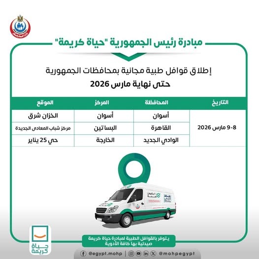 أعلنت وزارة الصحة عن انطلاق قوافل طبية مجانية في محافظات أسوان، والقاهرة، والوادي الجديد، مستمرة حتى نهاية مارس 2026، ضمن جهود مبادرة رئيس الجمهورية “حياة كريمة” لتقديم الخدمات الصحية للمواطنين بالمجان.