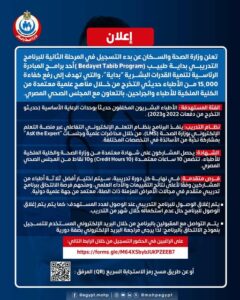 أعلنت وزارة الصحة والسكان عن فتح باب التسجيل للمرحلة الثانية من البرنامج التدريبي “بداية طبيب” (Bedayet Tabib Program)، ضمن المبادرة الرئاسية لتنمية القدرات البشرية “بداية”، والذي يهدف إلى رفع كفاءة 15,000 طبيب حديث التخرج من خلال مناهج علمية معتمدة من الكلية الملكية للأطباء والجراحين وبالتعاون مع المجلس الصحي المصري.