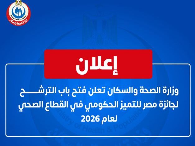 أعلنت وزارة الصحة والسكان فتح باب الترشح للمشاركة في الدورة الخامسة لجائزة مصر للتميز الحكومي في القطاع الصحي لعام 2026، التابعة لوزارة التخطيط والتنمية الاقتصادية، في إطار توجهات الدولة المصرية نحو تعزيز ثقافة التميز المؤسسي والارتقاء بجودة الخدمات الحكومية