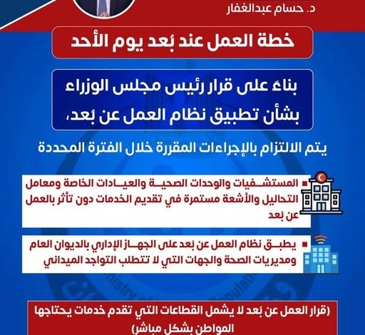 وأوضح الدكتور حسام عبد الغفار، أن المستشفيات والإسعاف والخدمات الحيوية في شبكات الصحة ستظل تعمل حضورياً بشكل منتظم، بينما يقتصر العمل الأونلاين على الديوان العام للوزارة والمديريات الصحية بالمحافظات والدوائر التي لا تتطلب التواجد الميداني.