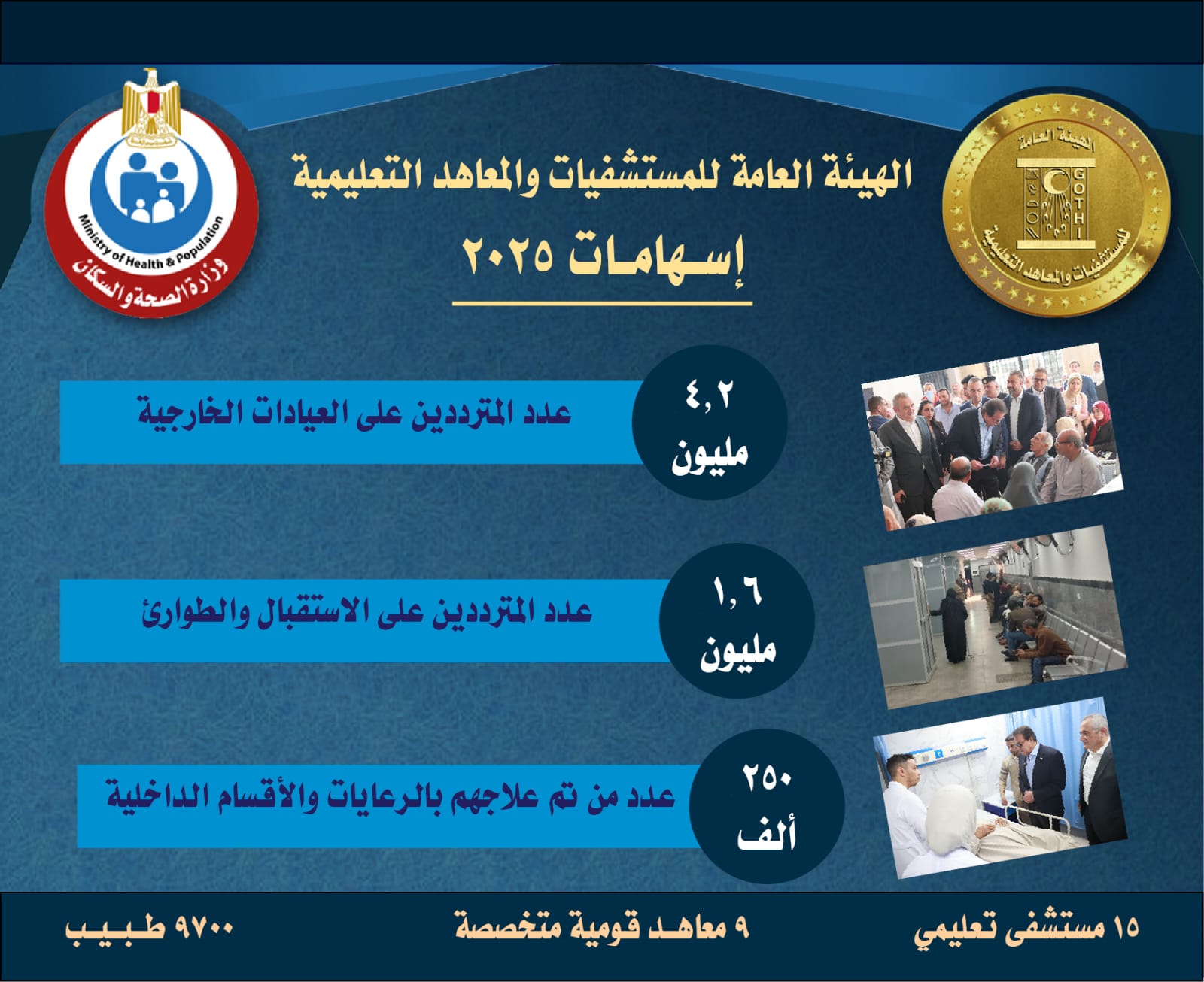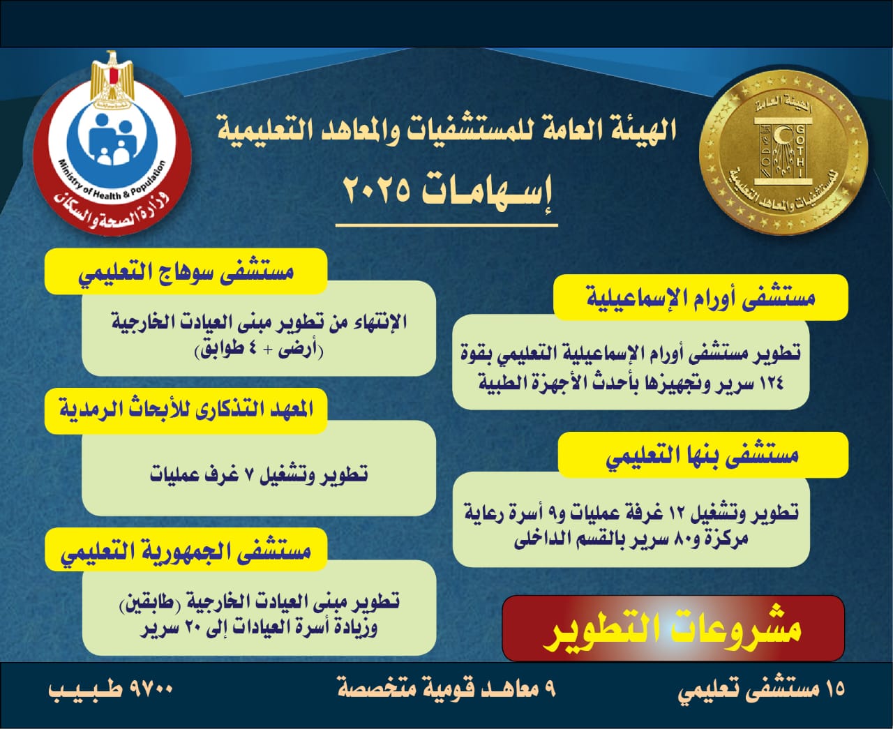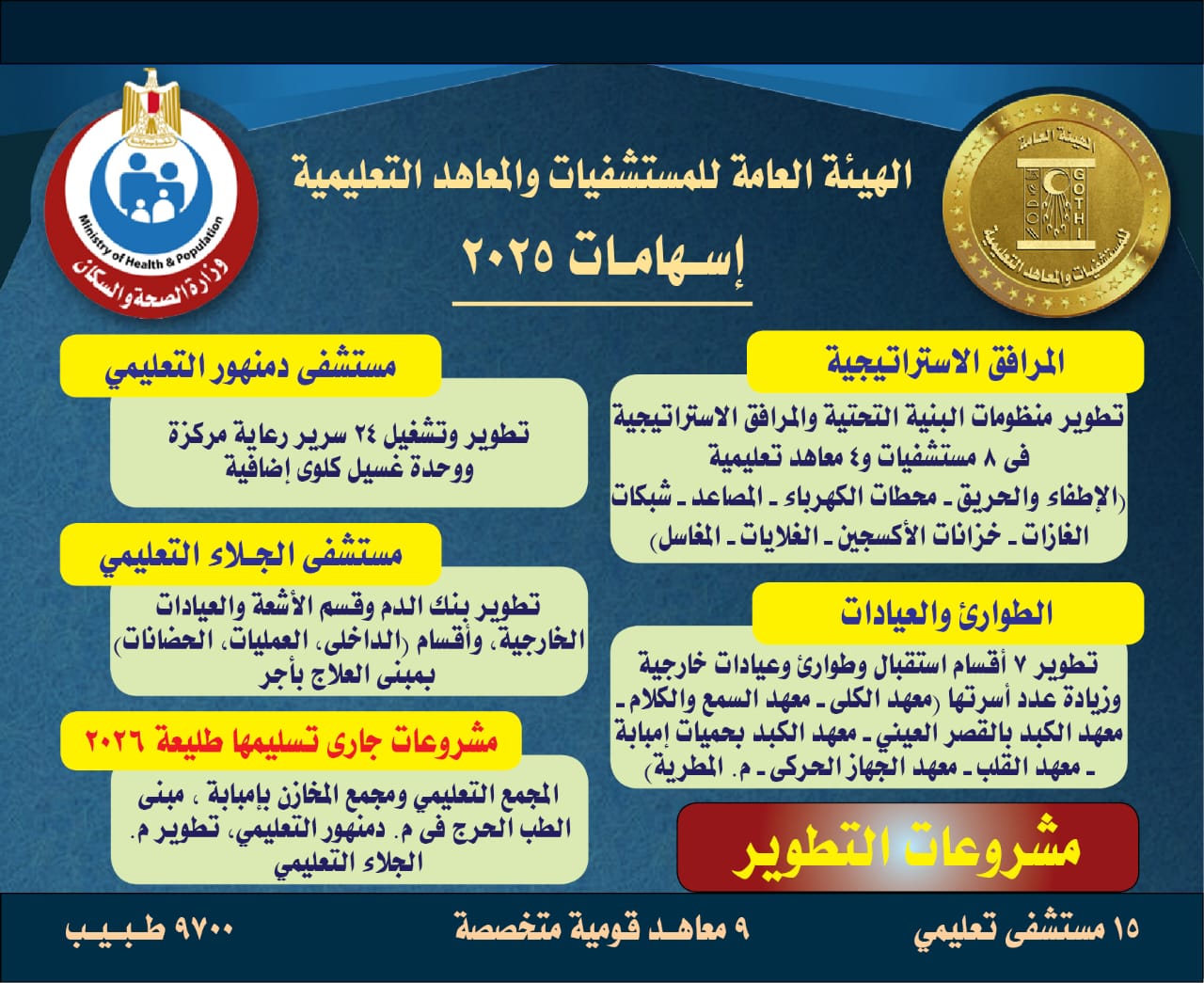 ويعكس هذا الحصاد حجم الجهد المبذول من الهيئة العامة للمستشفيات والمعاهد التعليمية لتعزيز جودة الرعاية الصحية، ودعم التعليم الطبي والبحث العلمي، بما يسهم في تحقيق أهداف الدولة في الارتقاء بالخدمات الصحية المقدمة للمواطنين.