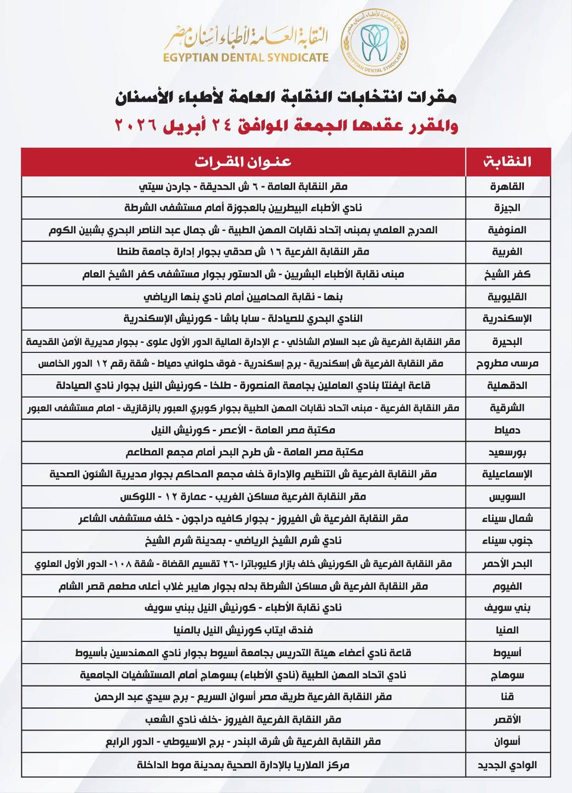 تنطلق اليوم الجمعة 24 أبريل 2026، انتخابات التجديد النصفي لنقابة أطباء الأسنان، لاختيار ممثلي النقابة العامة والمناطق والنقابات الفرعية، وذلك تحت إشراف قضائي كامل من النيابة الإدارية، فيما يتم استخدام نظام التصويت الإلكتروني في سابقة هي الأولى من نوعها.