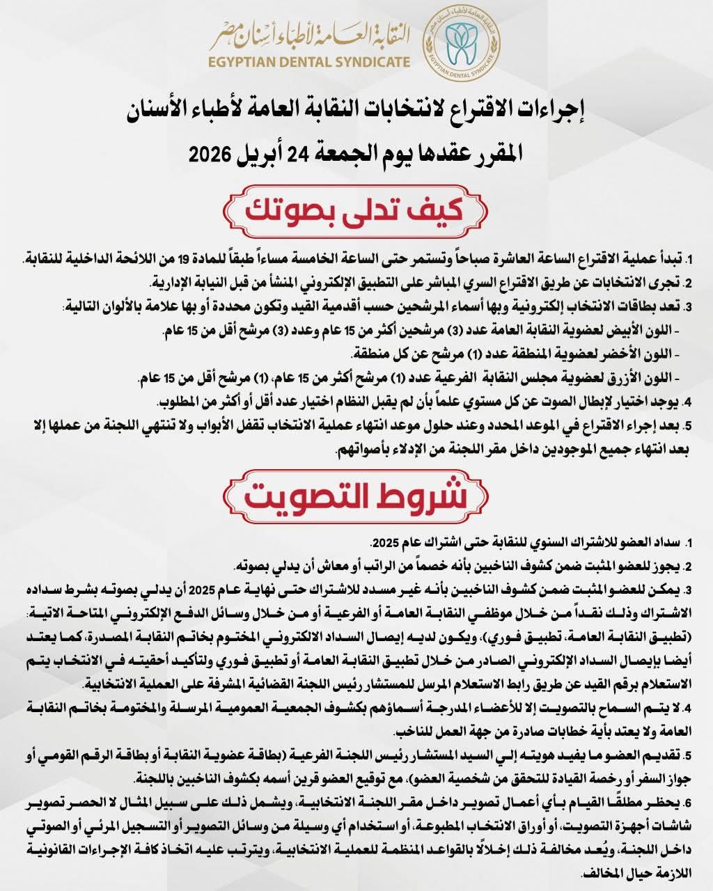 وأعلنت اللجنة المشرفة على الانتخابات، أن عملية الاقتراع تنطلق في الساعة العاشرة صباحا وتستمر حتى الخامسة مساءً، وذلك وفقا للمادة (19) من اللائحة الداخلية لنقابة الأسنان، عبر نظام اقتراع سري مباشر باستخدام تطبيق إلكتروني مخصص صممته النيابة الإدارية لضمان الدقة والنزاهة وسلامة الإجراءات.