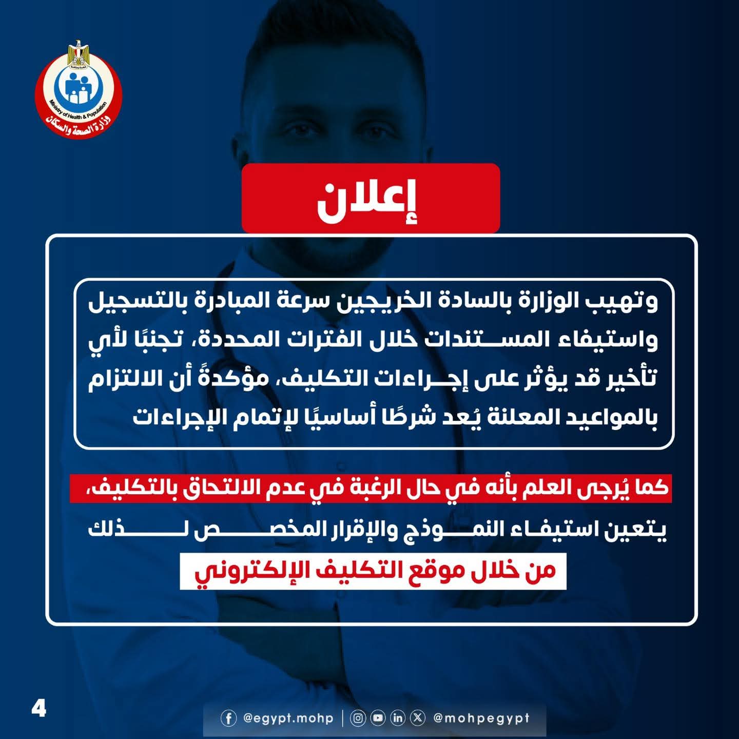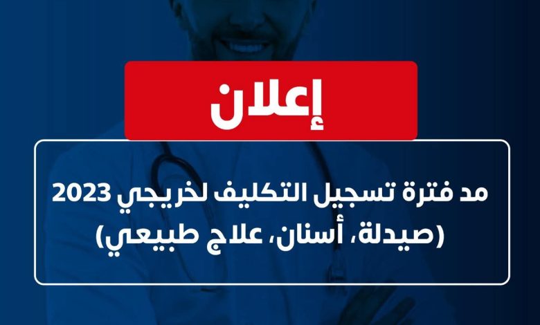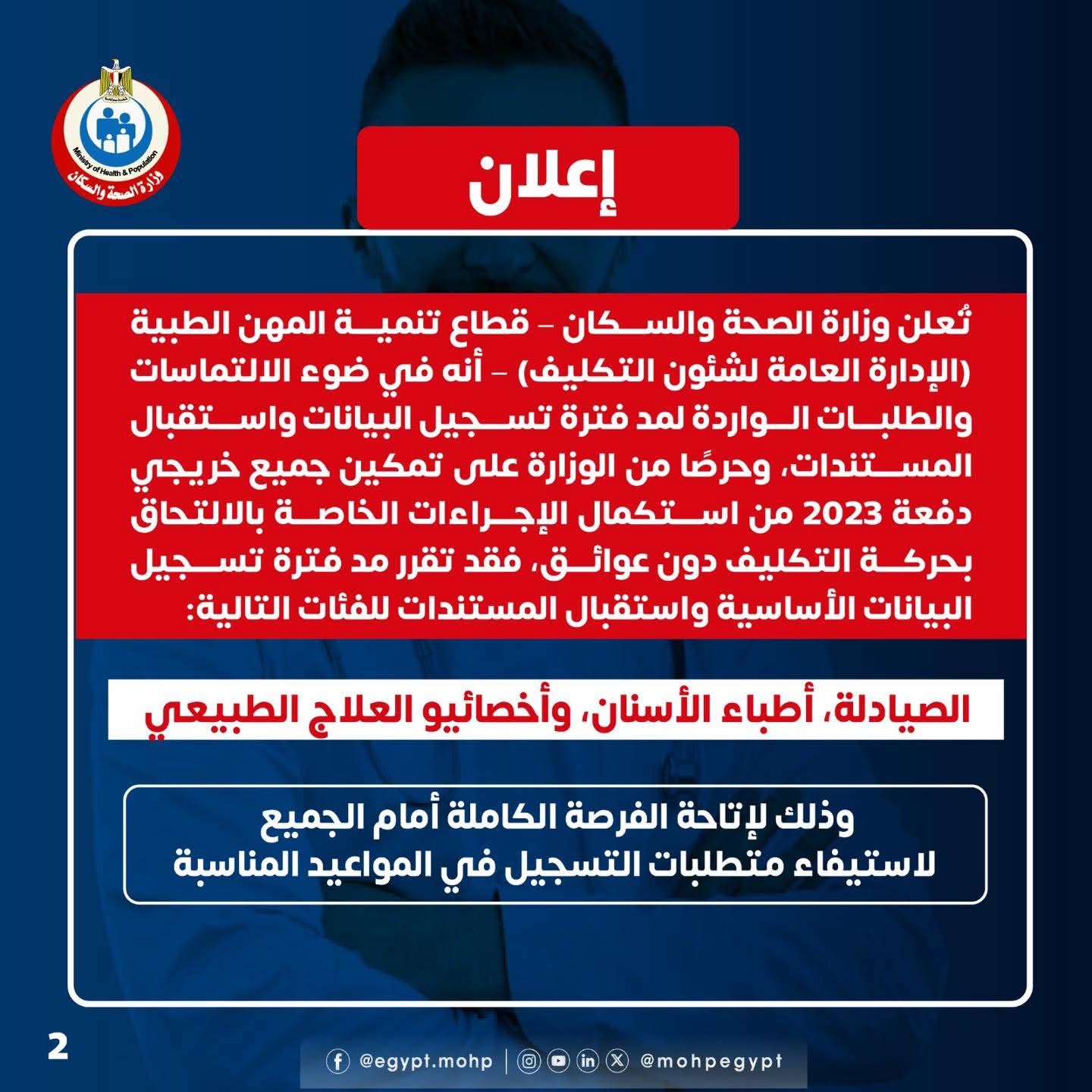 أعلنت وزارة الصحة والسكان، قطاع تنمية المهن الطبية (الإدارة العامة لشئون التكليف) – أنه في ضوء الالتماسات والطلبات الواردة لمد فترة تسجيل البيانات واستقبال المستندات، وحرصًا من الوزارة على تمكين جميع خريجي دفعة 2023 من استكمال الإجراءات الخاصة بالالتحاق بحركة التكليف دون عوائق، فقد تقرر مد فترة تسجيل البيانات الأساسية واستقبال المستندات للفئات التالية: