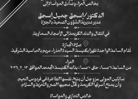 يتقدم الكاتب الصحفي هشام الهلوتى رئيس تحرير موقع صحتك٢٤ وجميع العاملين به بخالص العزاء والمواساه للدكتور إسحاق جميل وكيل وزارة الصحة بالجيزة وذلك في وفاة السيدة الفاضلة والدته نسأل الله أن يهب عائلته روح العزاء والصبر.