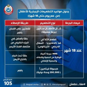 نشرت صفحة وزارة الصحة على موقع التواصل الاجتماعى فيس بوك جدول تطعيمات الأطفال حديثى الميلاد. وأكدت وزارة الصحة والسكان أن الالتزام بجدول التطعيمات الأساسية للأطفال منذ اليوم الأول للولادة وحتى عمر 18 شهرًا يُعد من أهم ركائز الوقاية الصحية، حيث يوفّر حماية فعّالة ضد العديد من الأمراض المعدية والخطيرة التي يمكن تجنبها بالتطعيم.
